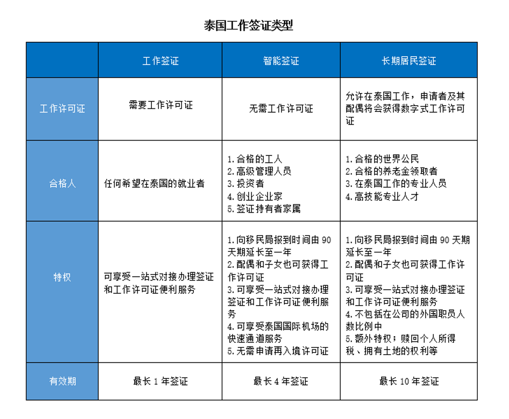 对于外国工人,《外国工作法》 要求所有在泰国工作的外国人都必须获得工作许可(有一些豁免)。除了标准的“工作签证”,泰国还推出了一些新型签证,旨在为外国工人提供更多便利。每种签证类型之间的差异如下: